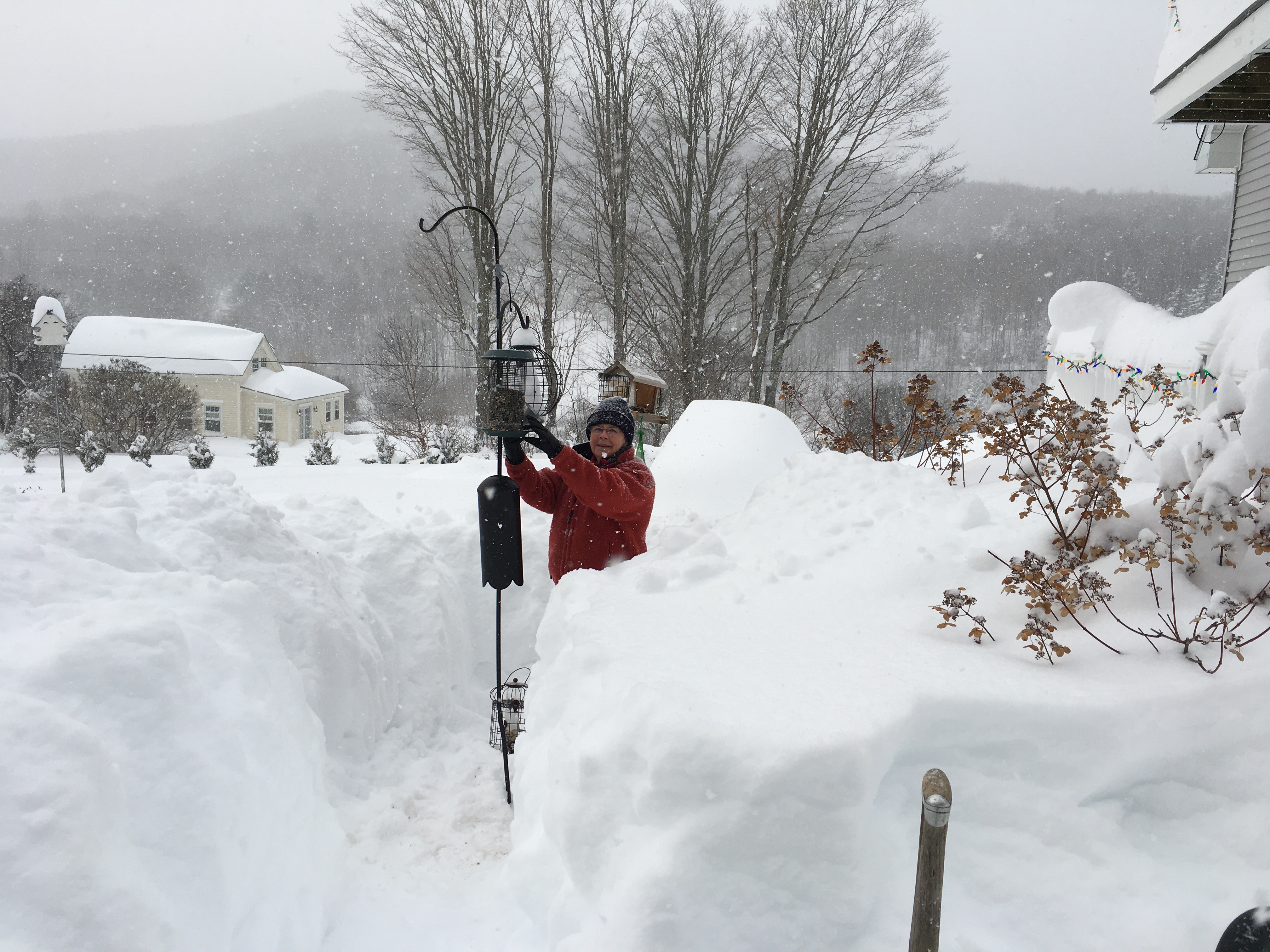 In the morning as the snowfall slowed we began to explore what was necessary to get outside. I could not even open the storm door on the front porch because the snow had come almost up to the doorknob and I could not get the door open. The back door was somewhat better – even though the snow had come well above above the top step on the stairway, because there was not a flat porch on which it could accumulate, I was able to open the storm door enough to squeeze out with one of my snow shovels which thankfully were accessible, having been stored in the downstairs garage. In trying to come down the three steps I was astonished to realize that the snow depth was well above my knees and thighs and almost to my waist. I literally could not move, it was simply too deep. So to get anywhere I had to dig a trench in which to walk, so I dug my first such trench out from the porch steps and then around the deck toward the front of the house where my spouse’s bird feeders were located because I knew that she would want to replenish them especially in the midst of such a huge snowfall. Thankfully, despite its incredible depth and quantity, the snow was relatively easy to shovel, being more of the light and fluffy variety rather than the wet and heavy type.