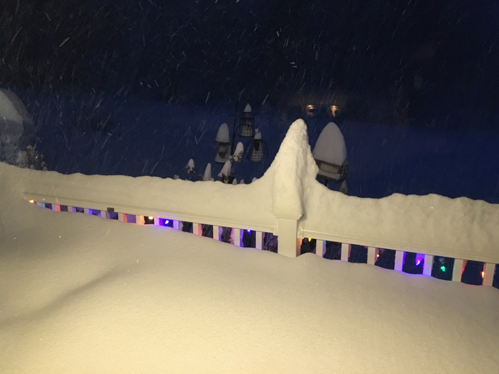 But in the middle of December we experienced a truly frightening event – a snowfall the like of which I had never experienced. Beginning in the late afternoon of December 16, the snow continued all night, accumulating at the rate of a couple of inches per hour. I arose around my usual time of about four in the morning, turned on the outside light on the front deck and was astonished to see snow accumulations and drifts approaching the top of the four foot railings. And it was still coming down heavily.