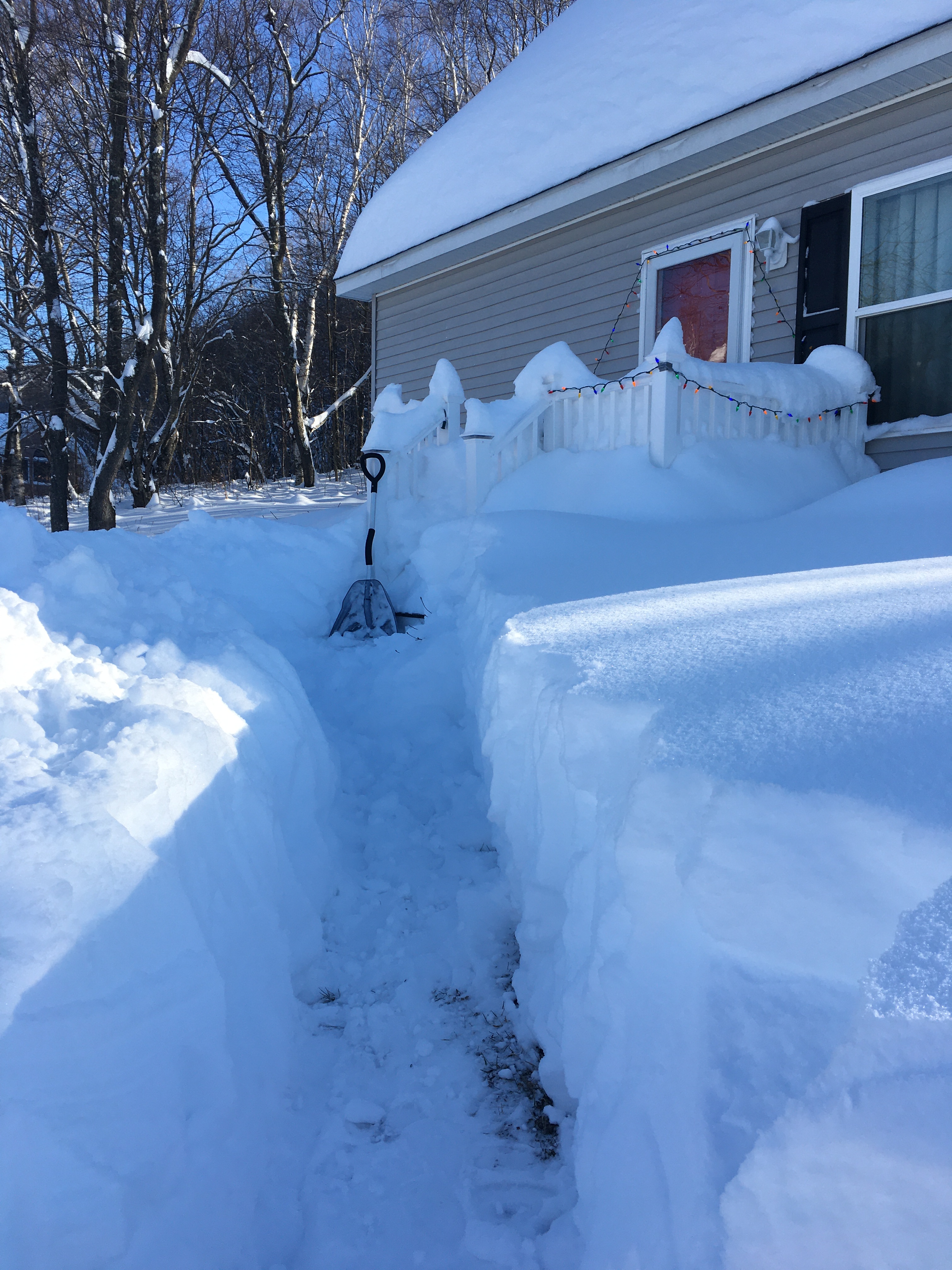 After the driveway was cleared, I proceeded to dig a trench along where I remembered our walk was, down to the stone steps to the driveway. Bobbie, armed with the other of our two snow shovels decided that she would attempt to dig from the other side of the driveway up to the front porch to free that up. Eventually she finally made her way to the porch and we both cleared off enough snow so that the front storm door could open.