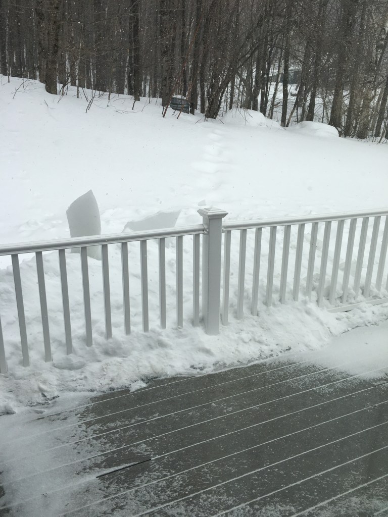 And after each snow, we’ve dutifully shoveled as much as we could, again clearing the walks to the bird feeders and down to the driveway, again clearing the upper and lower decks and the front porch. These duties have not aged well and have gotten monotonous and burdensome very quickly. I can see little pleasure in shoveling snow when I know well that more will come again very soon and present the same challenge. And the repeated snows, accompanied by the packing, the occasional slushy wet version and the occasional sunny day contributing some softening and melting, along with the repeated very low nighttime temperatures, have caused what has remained on the walks and driveway to turn to solid ice several inches thick. We have not seen the driveway gravel or any of the flat stones or brown grass of our walks since that pre Christmas thaw. And simply walking down the driveway to get the mail has become a dangerous challenge. The lower deck too over this winter has accumulated unremovable snow and slush to become a coat of thick ice. Recently with some sun and temperatures near freezing, I have been able to pry some chunks loose and toss them off the deck into the snow. I must say, it’s been nice to see more and more of the deck surface reappear.