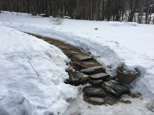 The next day around noon, with the storm finally gone and a bright sun illuminating the monstrous drifts, Jerry arrived with not only his snowblower, largely ineffective in snow of this depth, but with a helper with a pickup truck and snow blade, along with the customary assistance of his teenaged grandson armed with his snow shovel. Starting with the massive pile at the driveway entrance, and pushing right and left, the pickup truck was able to slowly make its way up the hill toward the house. Now, before leaving in the fall and before the first snow, it has been my practice to insert four foot fiberglass reflective wands every eight or ten feet along the edge of the long curve of the driveway so that it’s marked for anyone plowing or snow-blowing the drive. In this case, however, the markers had virtually disappeared because of the depth of the snow. So the plow, unable to follow the curve of the actual driveway, missed much of it and shaved strips of sod from the lawn and picked up various rocks trimming the edge of the drive and the long curved flower garden, all of which were now lodged in the huge piles of snow created by the plow.