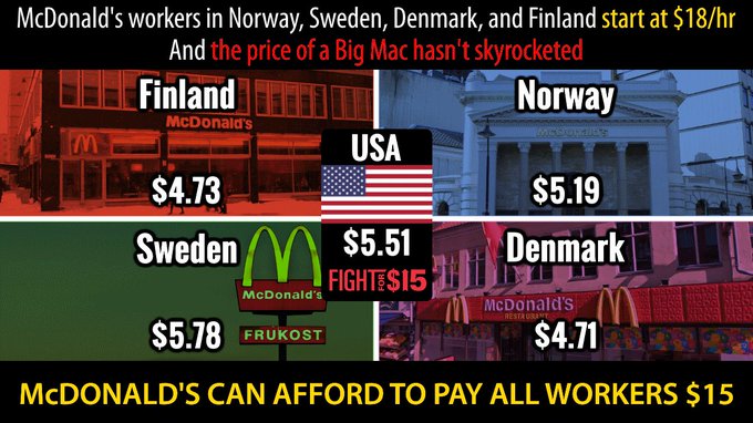 For example, fast food companies have long protested increasing wages to a living level because they would have to raise prices of menu items. This is simply not true. In other developed countries fast food workers are paid a living wage and menu items have not skyrocketed. Apparently the fast food owner, franchisee, or corporation would simply have to be satisfied with less profit.